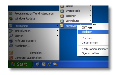 2. Klicken Sie nun mit der rechten Maustaste den Startmenüeintrag Kontoverwaltung an und wählen Sie in dem sich öffnenden Kontextmenü den Eintrag Explorer an. Dadurch öffnet sich der Order, in dem sich die Verknüpfung von EasyKont im Startmenü von Windows befindet.
