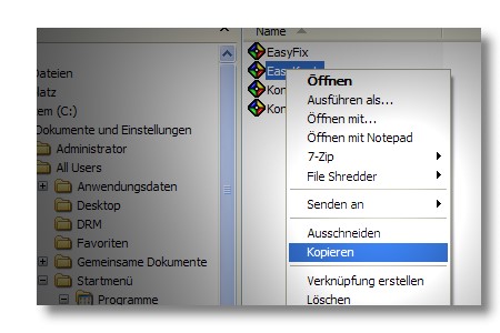 3. Klicken Sie die Verknüpfung von EasyKont mit der rechten Maustaste an und wählen Sie im Kontextmenü den Punkt Kopieren. Anschließend klicken Sie wieder mit der rechten Maustaste auf die freie Fläche im Ordner und wählen im Kontextmenü den Punkt Einfügen. Es sollte sich nun im Startmenüordner eine Verknüpfung mit der Bezeichnung Kopie von EasyKont befinden.