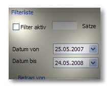 Die Filterkriterien lassen sich nur einstellen, solange der Filter nicht (Das Häckchen entfernen) aktiv ist. Zum ändern des Filters müssen Sie also erst den Filter deaktivieren. Der Zeitraum des Filters ist standardmässig auf ein Jahr vom aktuellen Datum zurück eingestellt. Ändern Sie das bitte entsprechend, falls Sie ältere Buchungen suchen.
