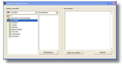 Den Konverter finden Sie nach der Installation von EasyKont für Windows im Startmenue. Starten Sie das Programm. Wählen Sie nun bitte das Laufwerk und das Verzeichnis aus, in dem sich die alten Kontendaten befinden. Sobald Sie das Verzeichnis gefunden haben, werden die Dateien angezeigt. Markieren Sie nun bitte alle Konten, die konvertiert werden sollen. Sollen es alle sein, klicken Sie auf den Knopf alle markieren.